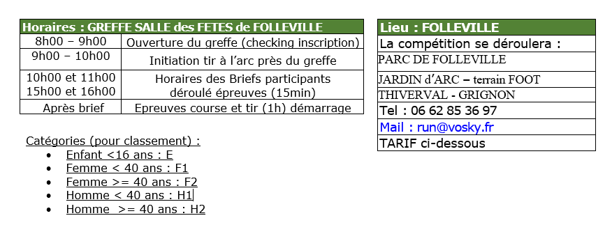 Buvette sur place toute la journée et possibilité de bénéficier d’une initiation au tir à l’arc le matin avant le 1er départ d’épreuves.